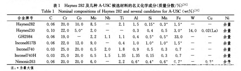 Haynes282是在镍基高温合金Cr20Ni80的基础上,根据不同的性能要求调整Cr、Ni含量,并添加不同的元素发展起来的。Haynes282合金以及其他几种A-USC机组候选材料的名义化学成分如下表所示,我们可以从表中看出Haynes282合金含有20%的Cr,而铬具有良好的抗氧化性。Haynes282的合金主要强化相为γ'相,γ'想含量越高,合金强度则越高,但是同时会造成合金加工性能越差,为了平衡强度和加工性能,Haynes282合金的γ'相含量经过优化,严格控制了Al和Ti的含量范围,使γ'相的平衡摩尔含量为19%左右,Co可以增加γ'相的数量,并提高γ'相的溶解温度,此外Haynes282合金中还含有8.5%的Mo,钼的大部分溶于基体,明显增大基体固溶体的晶格常数,起固溶强化作用,提高蠕变性能,少量Mo溶于γ'相,降低γ'相与基体的固溶度。合金中含有微量的C,与Cr等元素M23C6型碳化物。